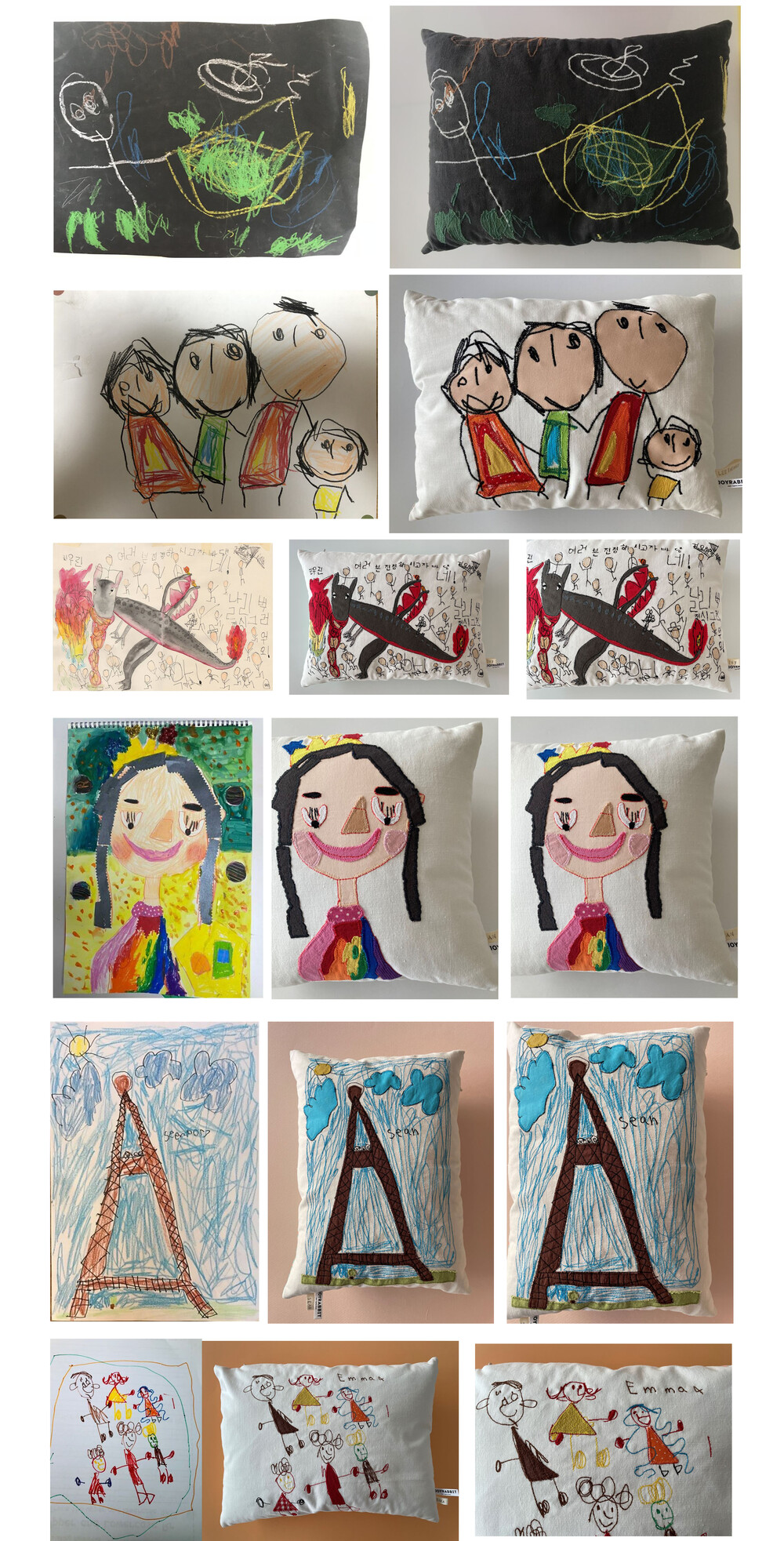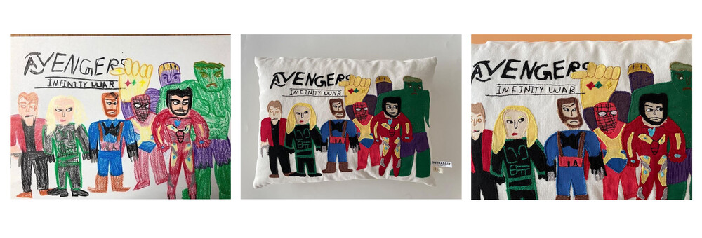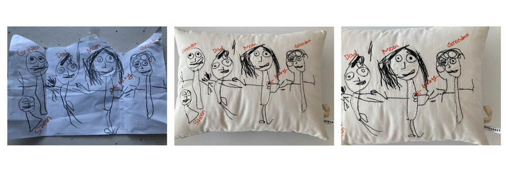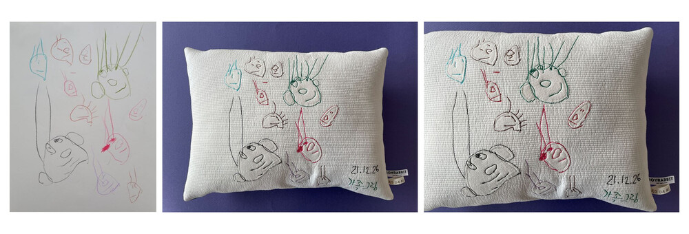 아이의 시간이 담긴 그림 쿠션은 원단에 프린팅하는 방식이 아닌, 원단 패치워크와 자수 스티치작업으로 만들어집니다.